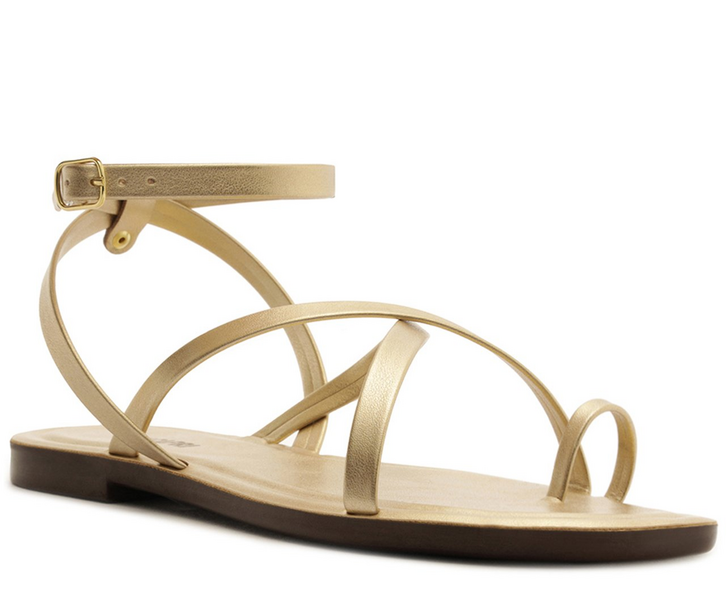 Sandália dourada, em material similar ao couro. O modelo possui solado rasteiro emborrachado e biqueira quadrada. O cabedal traz tiras finas: uma em dedeira, outras duas cruzadas sobre o peito do pé e mais uma que envolve o tornozelo, com fechamento lateral em fivela metálica ajustável. A palmilha dourada apresenta assinatura Anacapri.