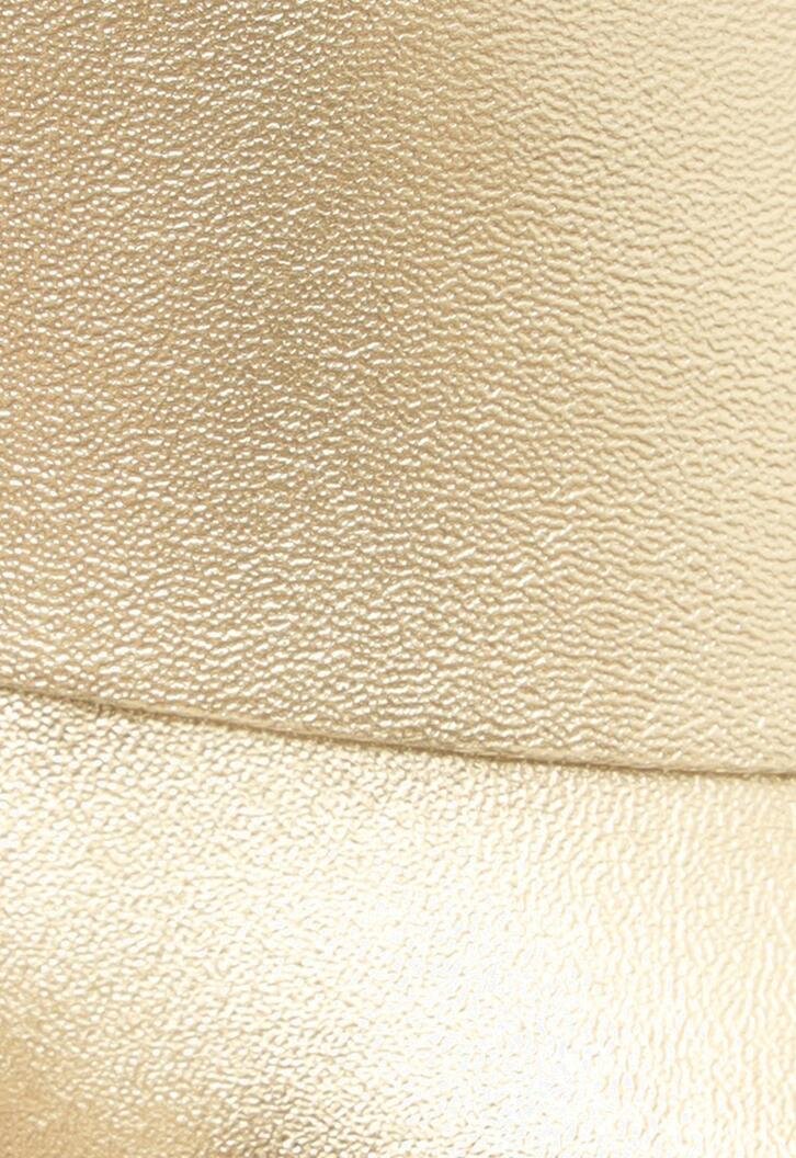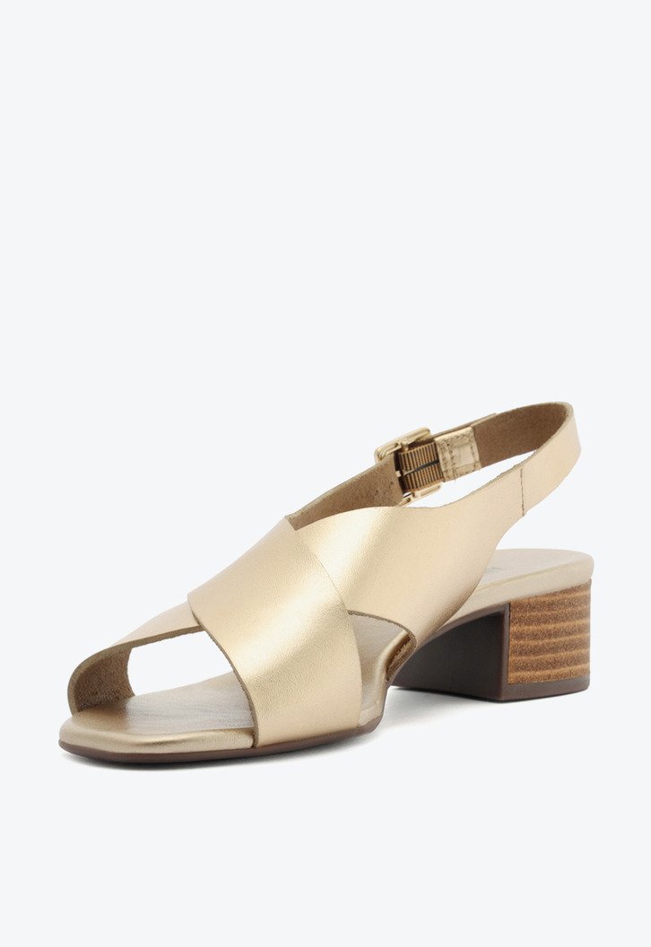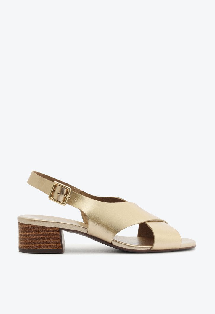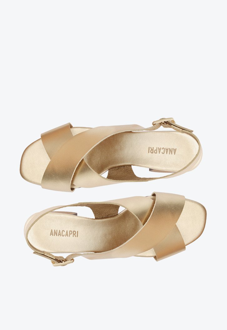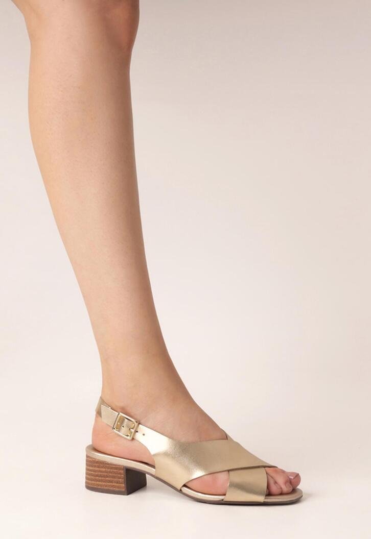 Sandália de salto bloco e tiras cruzadas, na cor dourada. O modelo de material similar ao couro, possui salto em bloco médio. Apresenta cabedal em duas tiras mais largas - que se cruzam em design de “X” - sobre os dedos e peito de pé, que seguem pelas laterais da pala e contornam o calcanhar, com fecho afivelado ajustável na lateral. De biqueira quadrada, traz palmilha acolchoada de mesmo tom da peça, com assinatura Anacapri.