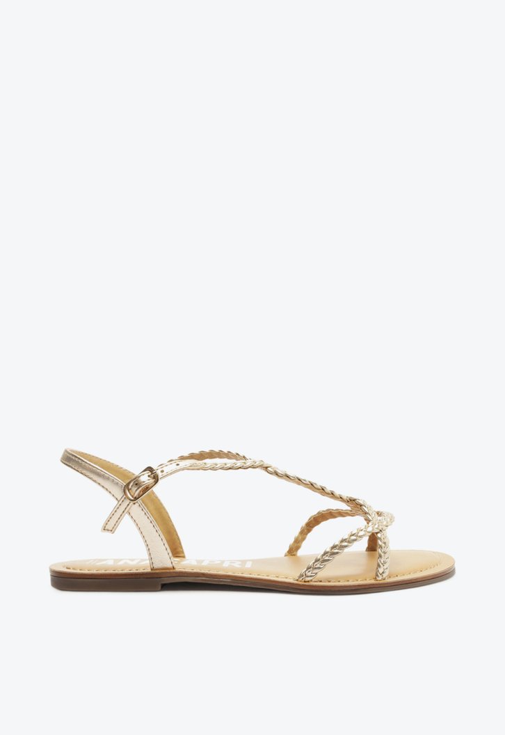 Sandália Anacapri de tira trançada dourada. O modelo tem solado rasteiro emborrachado marrom com leve saltinho e bico quadrado. Traz cabedal com tira fina trançada sobre os dedos e outras duas que se cruzam nas laterais sobre o peito de pé - que se conectam em uma tira lisa e afivelada que contorna o calcanhar. Com palmilha nude acolchoada contornada em pespontos e assinatura Anacapri.