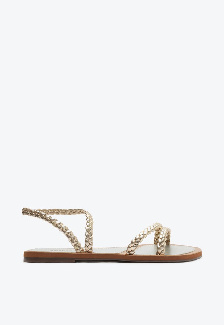 Sandália rasteira dourada. O modelo tem sola flat e bico redondo. Traz duas tiras finas trançadas sobre os dedos e mais uma tira trançada que sai da lateral e contorna o tornozelo. Com palmilha recortada no centro e da cor do modelo com inscrição Anacapri.