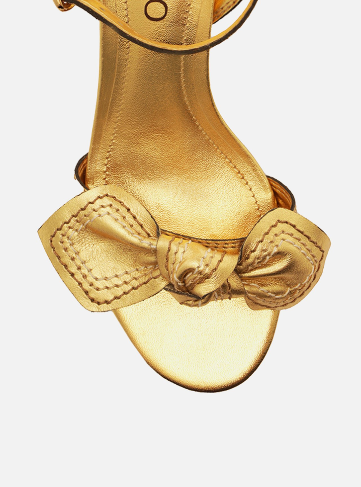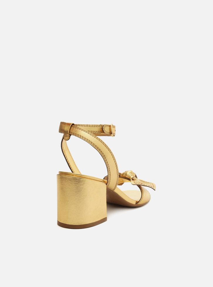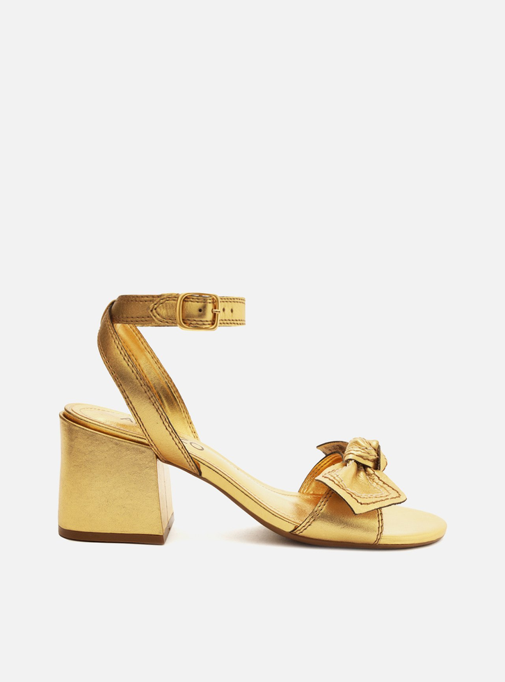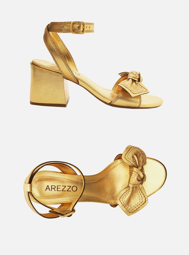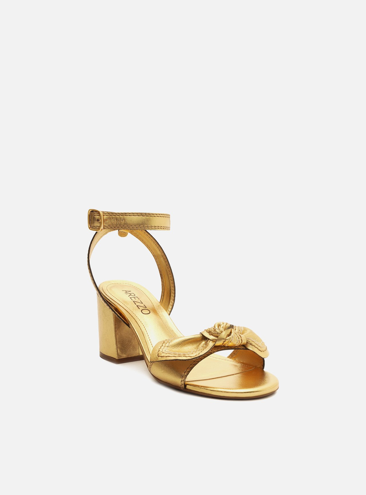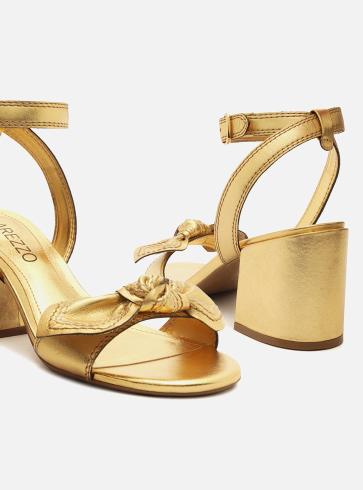 Sandália feminina dourada de couro. O sapato tem salto médio bloco e formato arredondado na ponta. Traz tira sobre os dedos com aplicação de tiras largas, com costura pesponto marcada, formando um laço. Possui tira que sai das laterais, se cruza no calcanhar, contorna o tornozelo e fecha em fivela lateral. Com palmilha da cor da sandália e inscrição do nome da marca. A sandália exibe todo o pé.