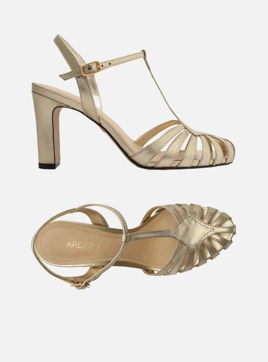 Sandália Dourada Arezzo Couro Salto Bloco Multi Tiras
