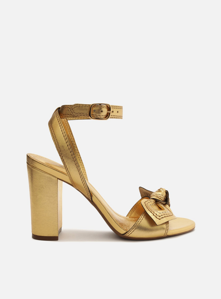 Sandália feminina dourada de couro. O sapato tem salto alto bloco e formato arredondado na ponta. Traz tira sobre os dedos com aplicação de tiras largas, com costura pesponto marcada, formando um laço. Possui tira que sai das laterais, se cruza no calcanhar, contorna o tornozelo e fecha em fivela lateral. Com palmilha da cor da sandália e inscrição do nome da marca. A sandália exibe todo o pé.