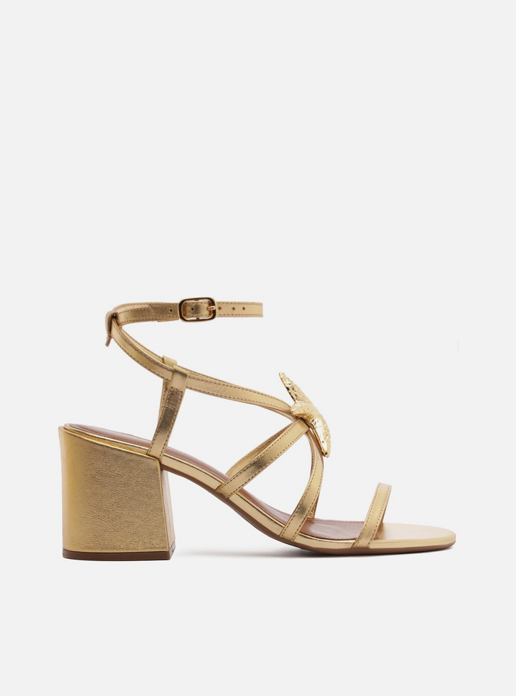 Sandália dourada de couro. O sapato tem salto médio bloco e formato arredondado na ponta. Traz tira fina sobre os dedos. Possui tira fina na parte superior do pé, com aplicação de metal em forma de estrela-do-mar, e mais duas tiras finas que saem das laterais frontais, cruzam na parte superior do pé e no calcanhar, contornam o tornozelo e fecham em fivela lateral. Com palmilha marrom e inscrição do nome da marca.