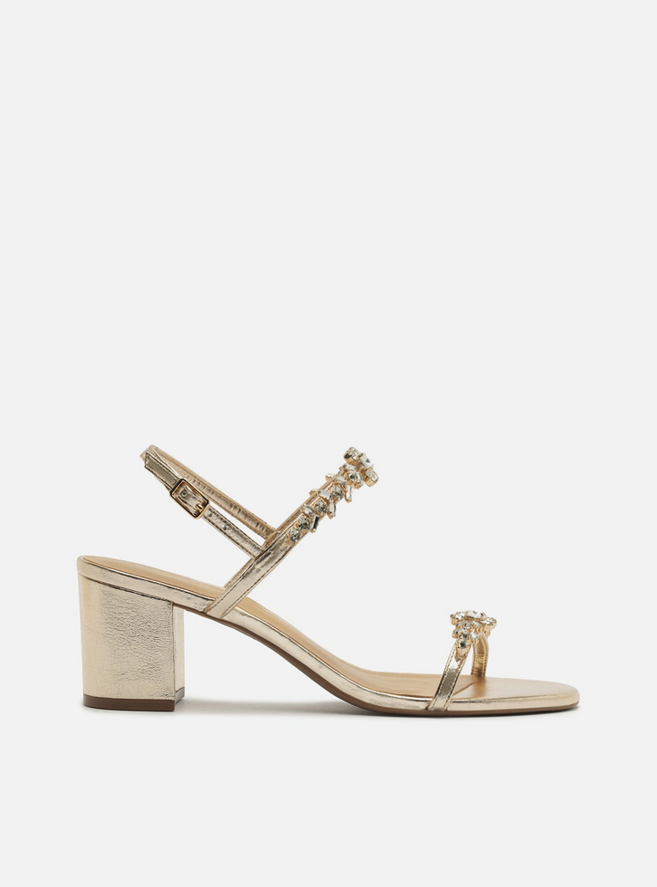 Sandália feminina dourada de couro. O sapato tem salto médio bloco e formato arredondado na ponta. Traz tiras finas sobre os dedos e na parte superior do pé, ambas com aplicação de pedrarias. Possui tira afivelada no calcanhar. Com palmilha bege e inscrição do nome da marca.