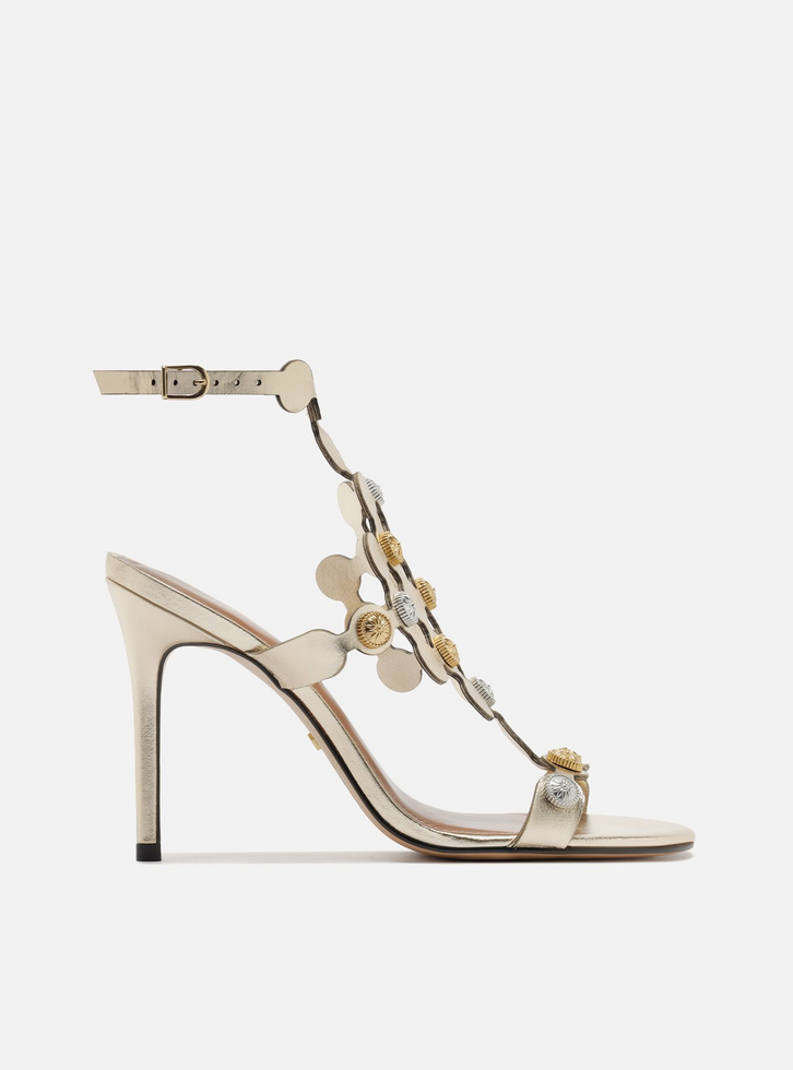 Sandália feminina dourada de couro. O sapato tem salto alto fino e formato arredondado na ponta. Traz tira sobre os dedos e estrutura em couro formada por peças redondas recortadas, na parte superior do pé, com aplicações metálicas. Possui tira fina, conectada ao cabedal, que contorna o tornozelo e fecha em fivela metálica. Com palmilha marrom e inscrição do nome da marca.