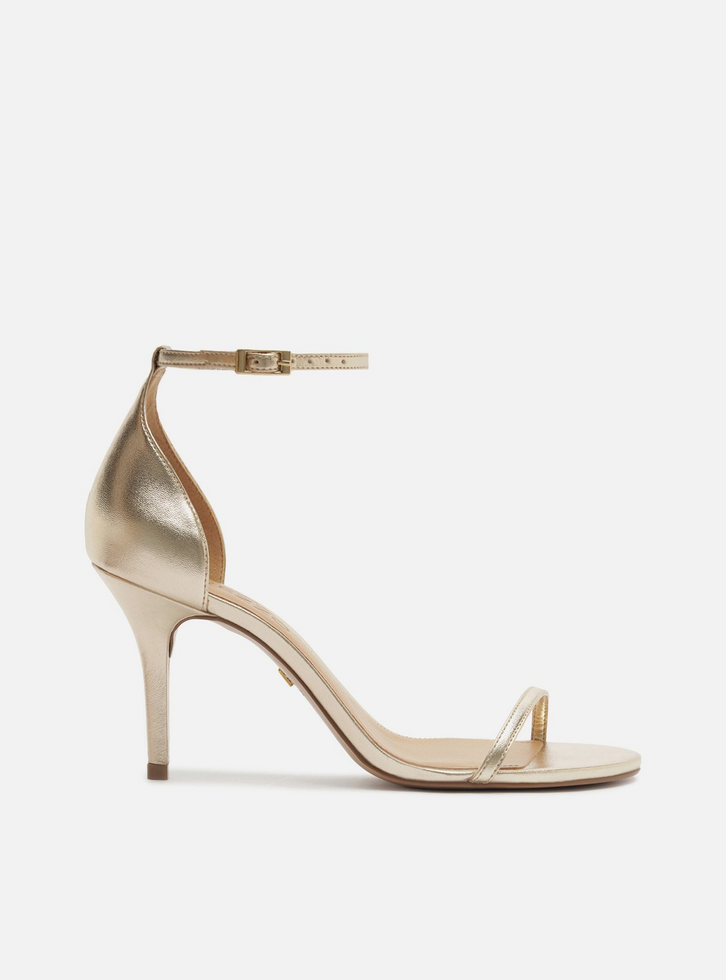 Sandália feminina dourada em couro. O sapato tem salto médio fino e formato arredondado na ponta. Traz tira fina sobre os dedos. Possui tira fina que sai das laterais, cruza na parte interna, contorna o tornozelo e fecha em fivela lateral. Com palmilha bege e inscrição do nome da marca.