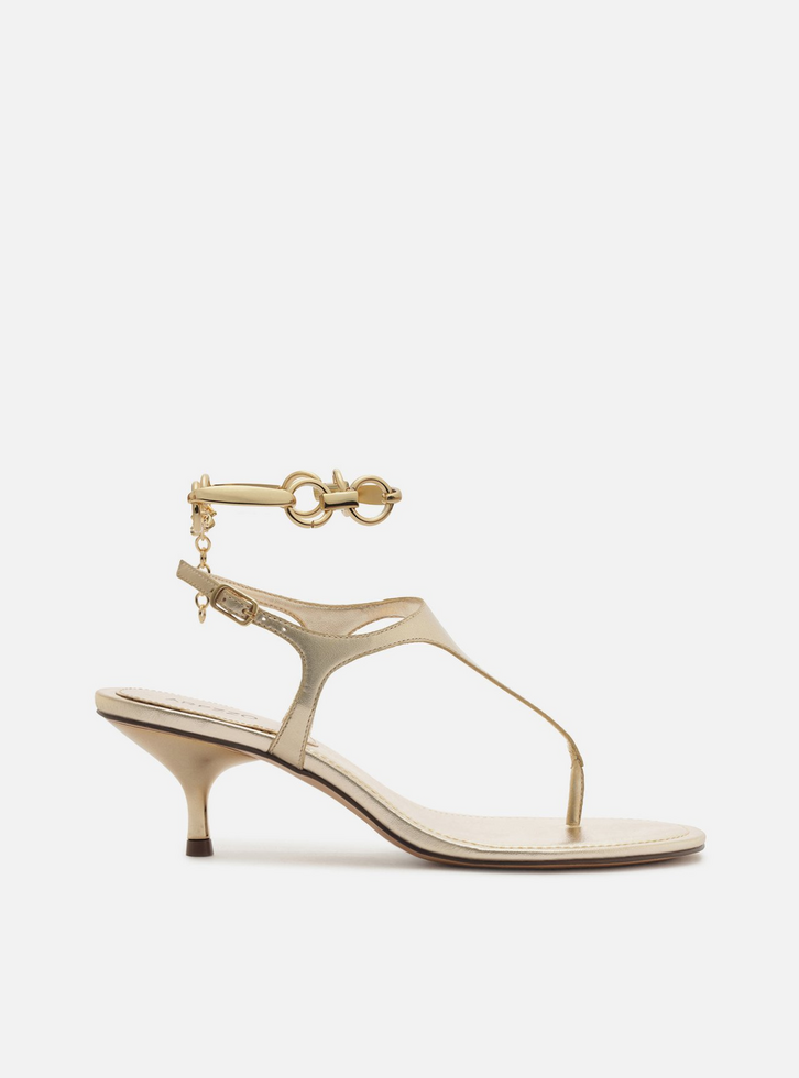 Sandália feminina dourada de couro. O sapato tem salto baixo fino e formato arredondado na ponta. Traz tira fina dividindo os dedos e tira afivelada em torno do tornozelo. Com palmilha da cor da sandália e inscrição do nome da marca. Acompanha tira tornozeleira em metal dourado com elos, presa na parte de trás.