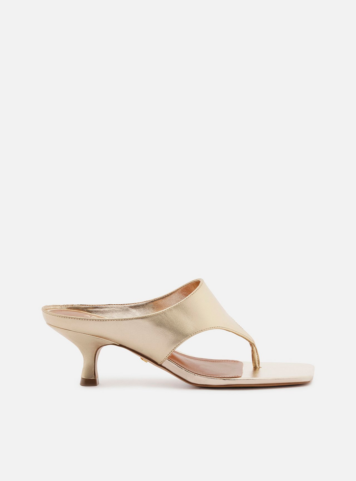 Sandália feminina dourada de couro. O sapato tem salto baixo fino e formato quadrado na ponta. Traz tira larga dividindo os dedos, em formato triangular, que cobre parcialmente a parte superior do pé até as laterais. Com palmilha marrom e inscrição do nome da marca.