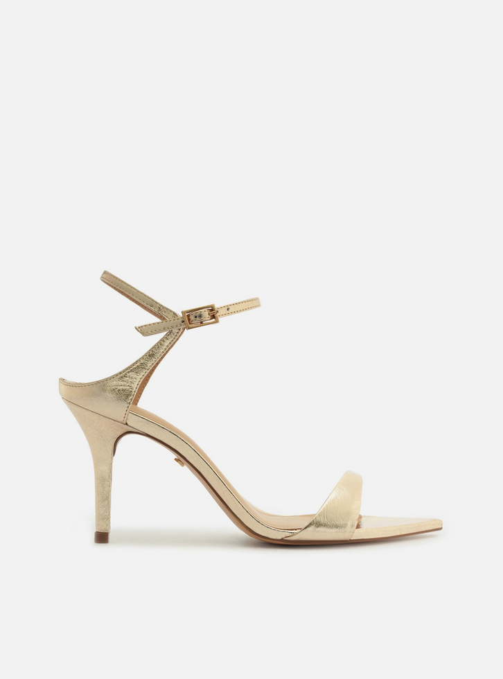 Sandália feminina dourada de couro. O sapato tem salto médio fino e ponta fina folha. Traz tira sobre os dedos. Possui tira fina diferenciada no calcanhar e tornozelo, conectada à tira frontal com fecho em fivela metálica lateral. Com palmilha lisa bege e inscrição do nome da marca.