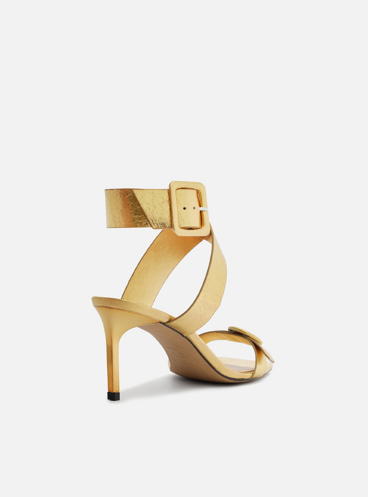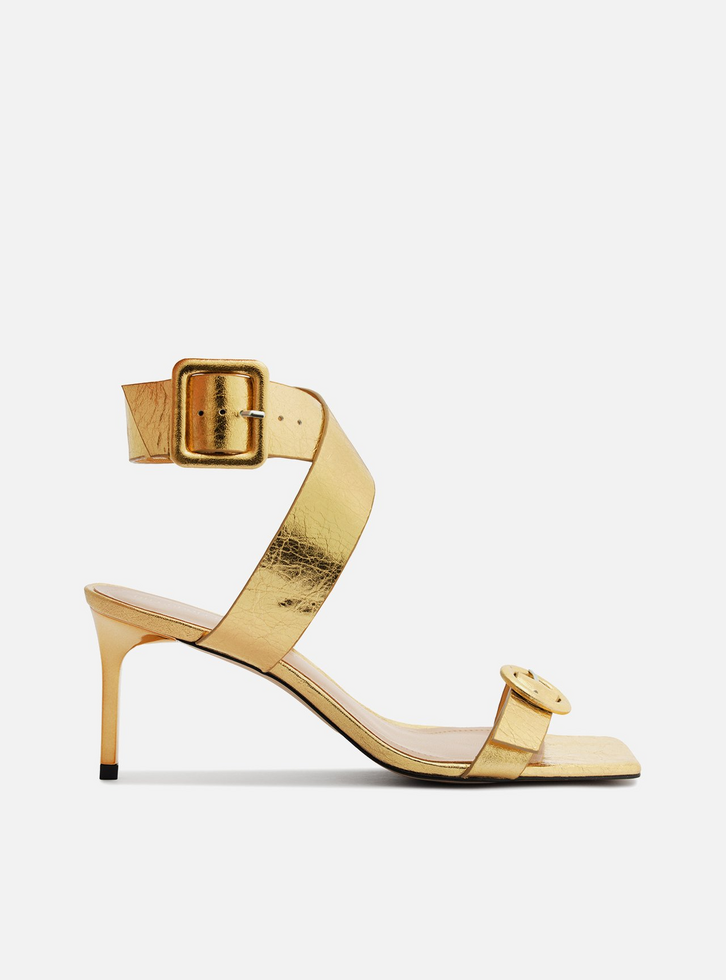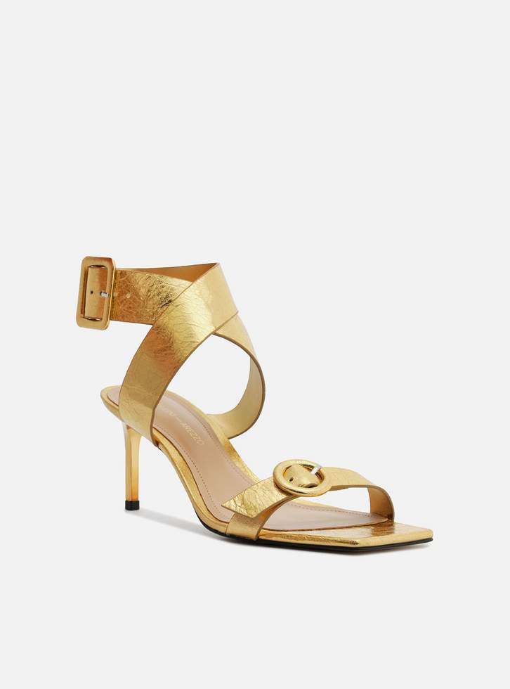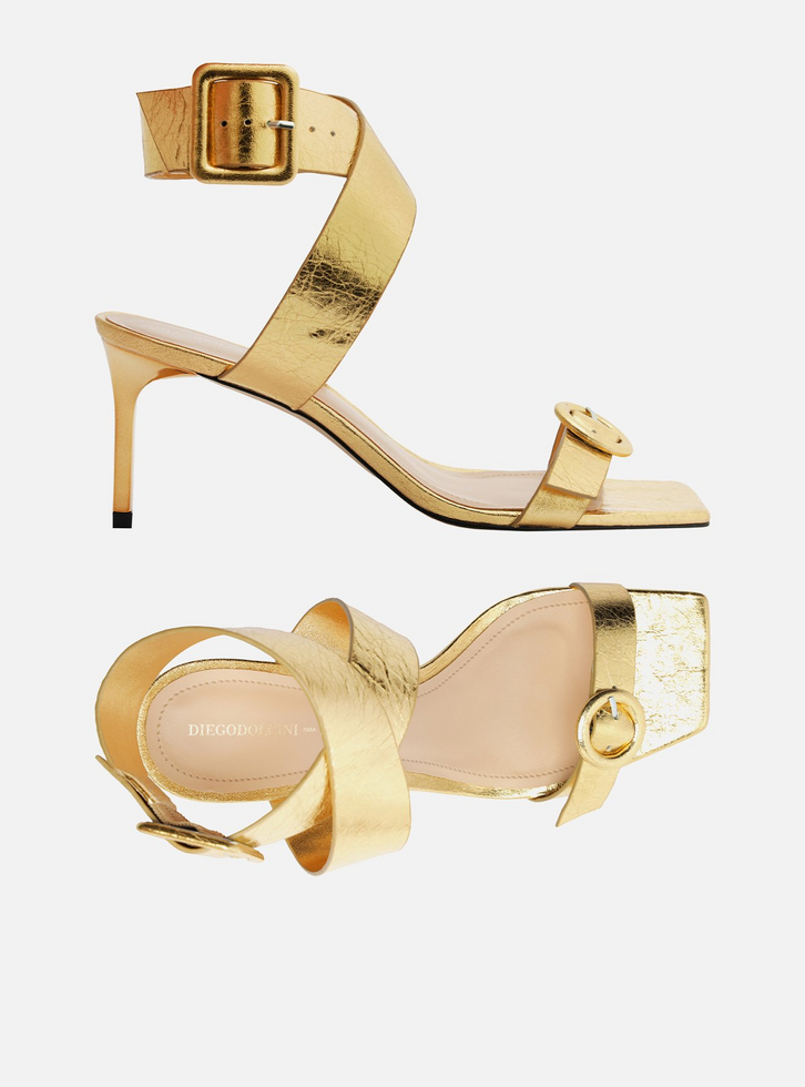 Sandália feminina dourada em couro. O modelo tem salto médio fino e bico quadrado. Traz tira média sobre os dedos com detalhe em fivela. Possui duas tiras largas que saem das laterais, se cruzam no peito do pé e fecha em fivela lateral. Com palmilha bege e inscrição do nome da marca.