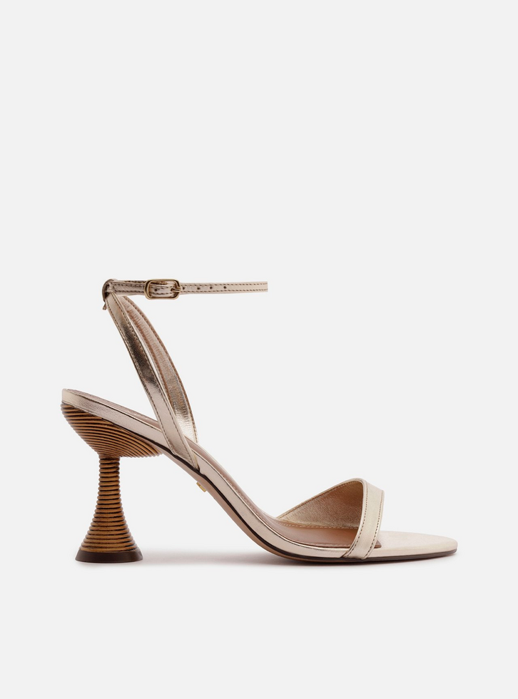 Sandália feminina dourada em couro. O sapato tem salto médio geométrico em formato taça, revestido em material com efeito listrado, e formato arredondado na ponta. Possui tira sobre os dedos, mais larga em uma das laterais, além de tira fina que sai das laterais, cruza no calcanhar, contorna o tornozelo e fecha em fivela metálica lateral. Com palmilha marrom e inscrição do nome da marca.