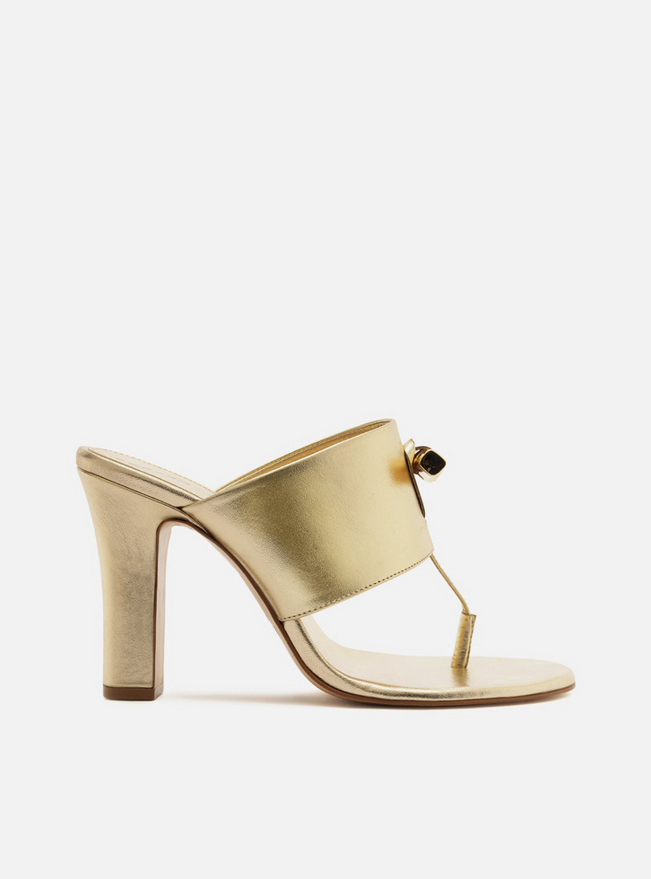 Sandália feminina dourada de couro. O sapato tem salto médio fino e formato arredondado na ponta. Traz tira larga na parte superior do pé, com detalhe em metal dourado, e tira fina dividindo os dedos. Com palmilha da cor da sandália e inscrição do nome da marca.