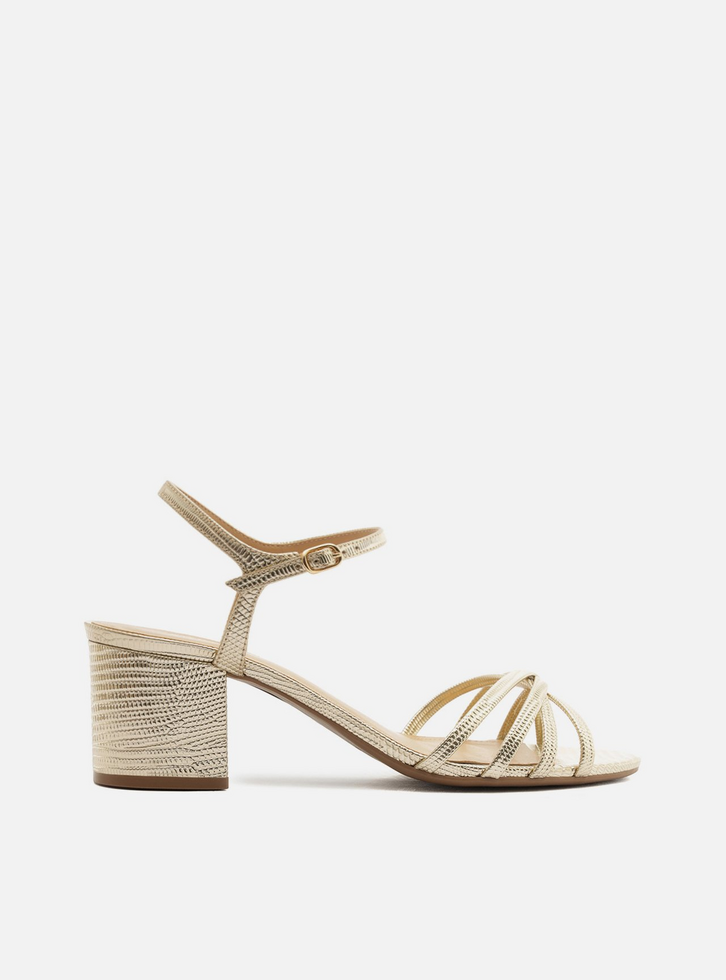 Sandália feminina dourada em material com textura lizard. O sapato tem salto médio bloco e formato arredondado na ponta. Traz tiras finas e metalizadas sobre os dedos, além de tira fina no tornozelo com fivela lateral ajustável. Com palmilha bege e inscrição do nome da marca.