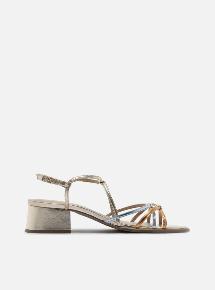Sandália feminina dourada e colorida. O sapato tem salto baixo bloco e formato arredondado na ponta. Traz tiras finas metalizadas sobrepostas na parte superior do pé, unidas por metais. Possui tira fina no calcanhar com fecho em fivela lateral. Com palmilha bege e inscrição do nome da marca. Aberta, a sandália exibe todo o pé.