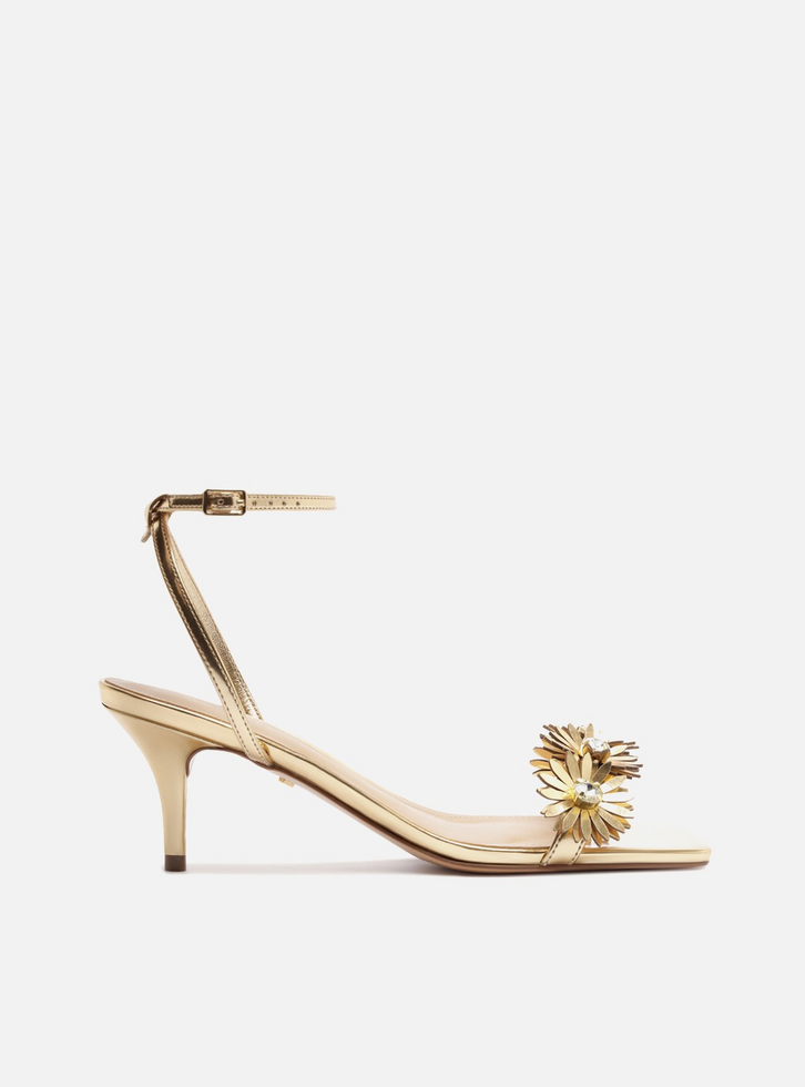 Sandália feminina dourada. O sapato tem salto baixo fino e formato quadrado na ponta. Traz tira fina sobre os dedos com aplicação de flores. Possui tira fina que sai das laterais, cruza no calcanhar, contorna o tornozelo e fecha em fivela lateral. Com palmilha bege e inscrição do nome da marca.
