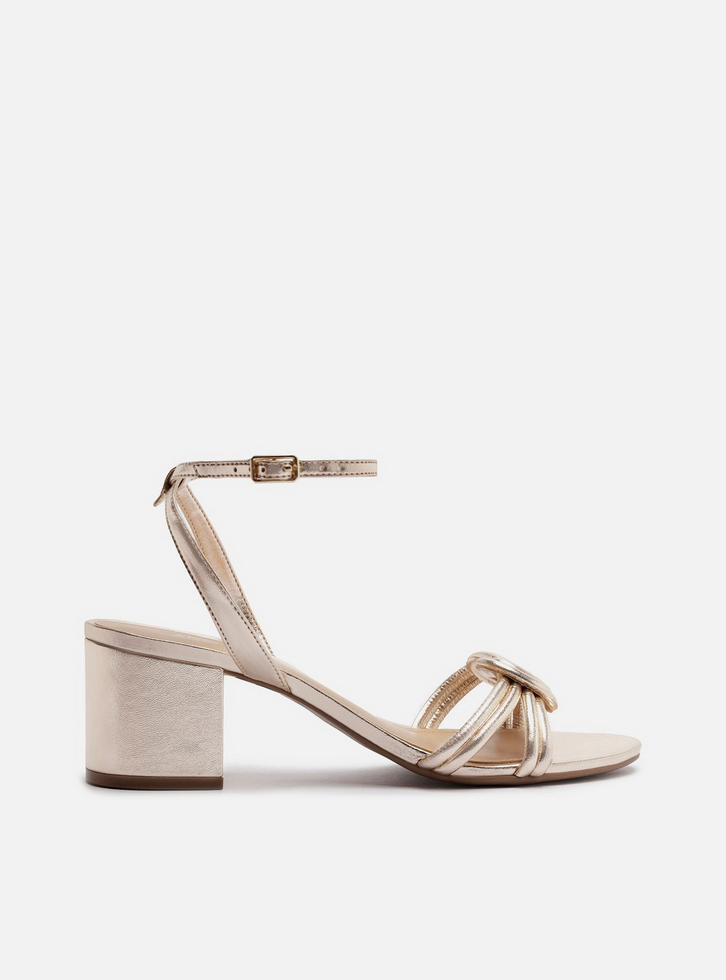 Sandália feminina dourada. O sapato tem salto médio bloco e formato arredondado na ponta. Traz cabedal formado por tiras finas que criam um enlace geométrico sobre os dedos. Possui tiras finas que saem das laterais, cruzam no calcanhar, contornam o tornozelo e fecham em fivela lateral. Com palmilha bege e inscrição do nome da marca.