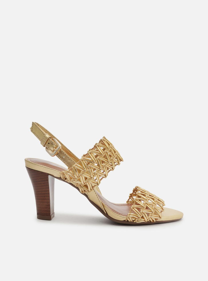 Sandália dourada. O modelo tem salto médio bloco em fachete e bico redondo. Traz duas tiras largas e tramadas sobre os dedos e o peito do pé. Possui tira fina em torno do calcanhar com fivela metálica lateral. Com palmilha marrom e inscrição do nome da marca. A sandália exibe parte do pé.