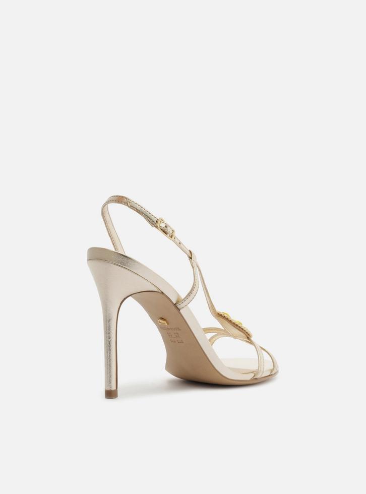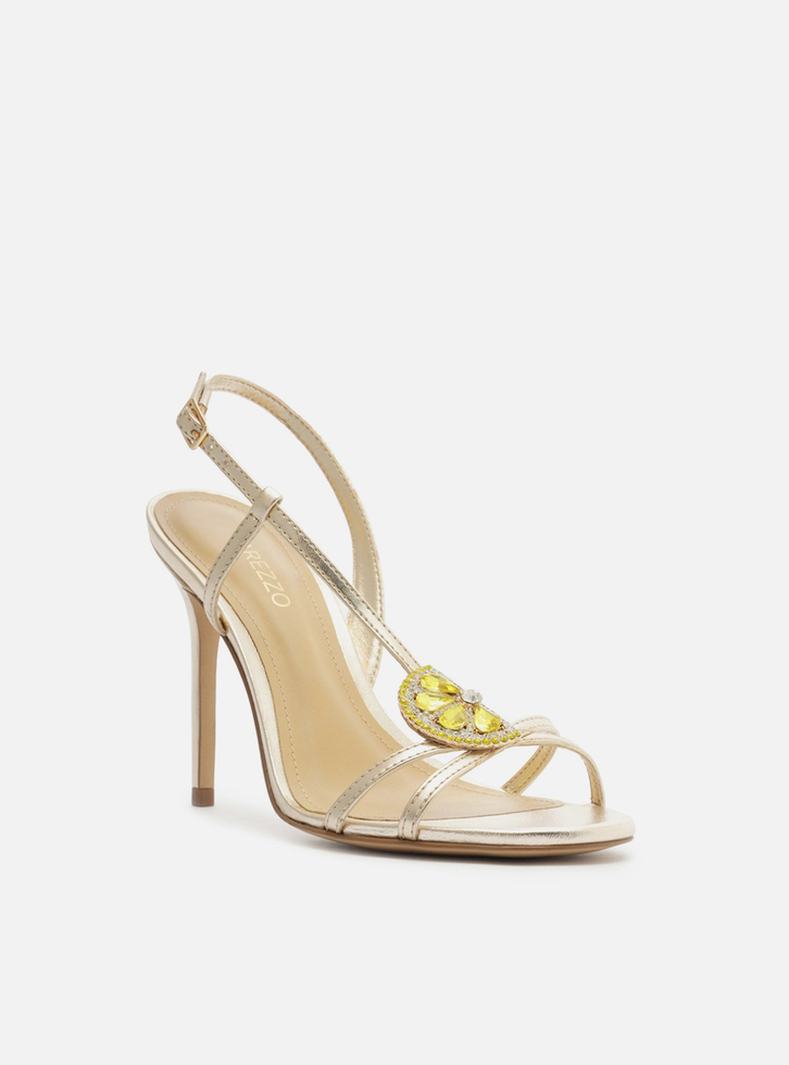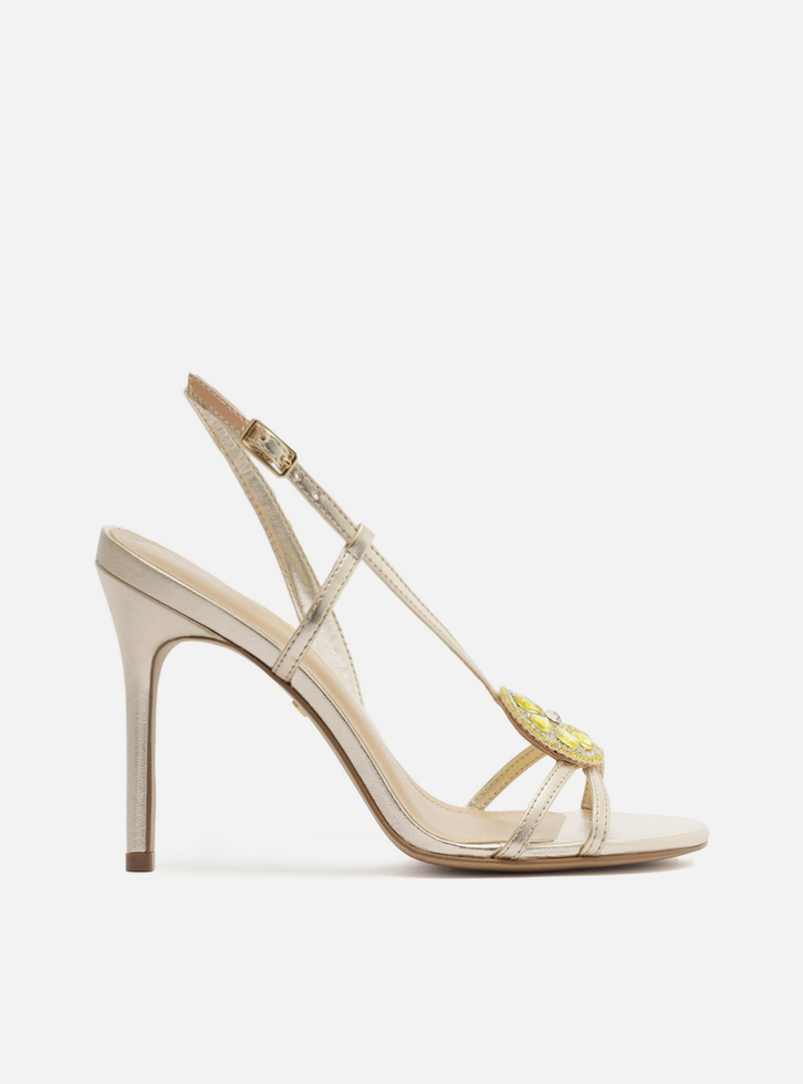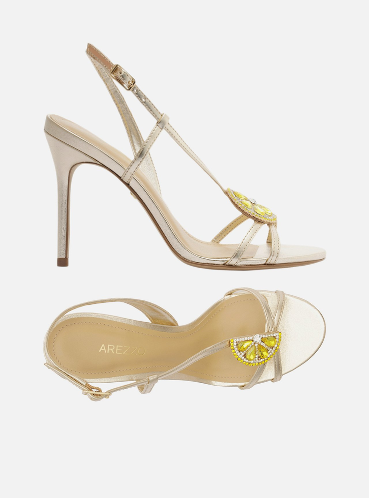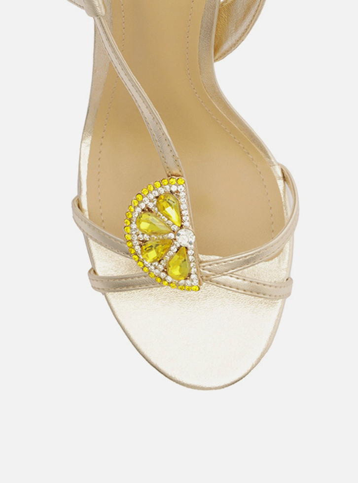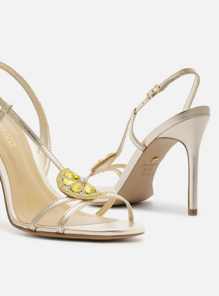 Sandália dourada. O sapato tem salto alto fino e formato arredondado na ponta. Traz tiras finas cruzadas sobre os dedos. Possui tira fina na parte superior do pé, com aplicação de peça em formato de meia rodela de limão cravejada de metais prateados e amarelos, conectadas às tiras frontais. Essa tira se conecta a outra que sai da lateral, contorna o calcanhar e fecha em fivela lateral. Com palmilha bege e inscrição do nome da marca.