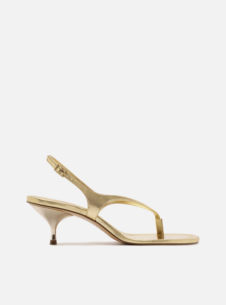 Sandália feminina dourada. O sapato tem salto baixo fino e formato arredondado na ponta. Traz tiras finas dividindo os dedos, que seguem pelas laterais até o calcanhar com fecho em fivela metálica. Com palmilha da cor do calçado, contorno em pesponto e inscrição do nome da marca. A sandália exibe todo o pé.