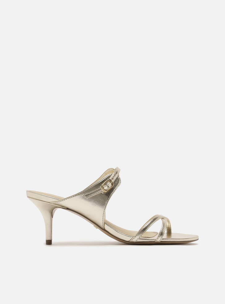 Sandália feminina dourada. O sapato tem salto médio fino e formato arredondado na ponta. Traz tiras finas cruzadas sobre os dedos e na parte superior do pé, além de tira central com fivela metálica. Aberta, possui calcanhar livre e palmilha bege com inscrição do nome da marca.