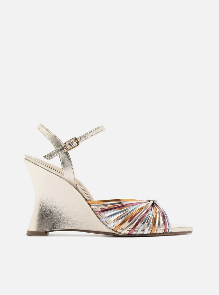 Sandália feminina dourada com textura snake. O sapato tem salto alto anabela curvo e formato arredondado na ponta. Traz tira finas, coloridas e metalizadas sobre os dedos e unidas por enlace no centro. Possui tira fina no calcanhar, conectada à tira fina no tornozelo que fecha em fivela lateral. Com palmilha marrom e inscrição do nome da marca.