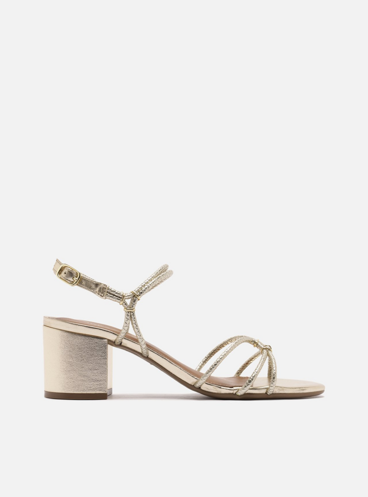 Sandália feminina dourada com textura snake. O sapato tem salto médio bloco e formato arredondado na ponta. Traz tiras finas sobre os dedos e na parte superior do pé, unidas por pequenos elos metálicos centrais. Possui tira fina afivelada em torno do tornozelo. Com palmilha marrom e inscrição do nome da marca.