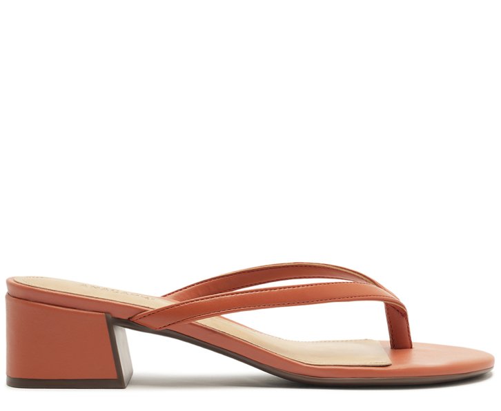 Sandália de salto bloco com duas tiras, na cor laranja. O modelo possui salto em bloco baixo e biqueira arredondada. Traz cabedal com duas tiras centrais que passam entre os dedos e seguem pelas laterais. Aberta atrás, com palmilha comfy nude e assinatura Anacapri.