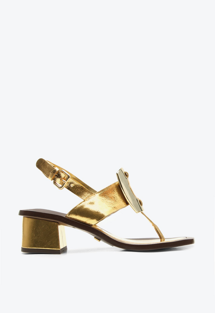 Sand�lia feminina Faro dourado. O mix entre o salto bloco e o maxi adorno frontal metalizado cria uma proposta moderna e marcante, com est�tica boho e acabamento refinado. Essa sand�lia � o tipo de pe�a que transforma o visual, adicionando atitude e sofistica��o de forma natural, perfeita para elevar produ��es minimalistas e dar destaque a combina��es com tecidos leves e shapes amplos.
