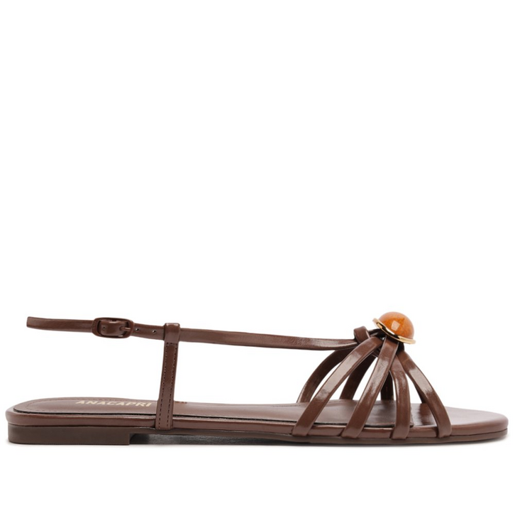 Sandália rasteira de multitiras e detalhe em pedraria, na cor marrom. O modelo de biqueira arredondada, possui solado emborrachado, com leve saltinho traseiro. Apresenta cabedal com quatro tirinhas - arrematadas na parte central por maxi adorno redondo em pedraria colorida, com contorno metálico sobre os dedos - que seguem do peito do pé, presas pelas laterais. Traz fecho em fivela regulável em tira que contorna o calcanhar. Apresenta palmilha emborrachada confortável, no mesmo tom da rasteirinha, com assinatura Anacapri em carimbo metálico.