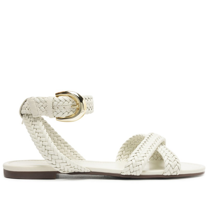 Sandália rasteira de tiras trançadas, na cor branca. O modelo imponente apresenta cabedal com duas tiras mais largas - com efeito trançado - que se cruzam sobre os dedos. De material similar ao couro e biqueira arredondada, possui solado emborrachado marrom, com leve saltinho traseiro. Na parte traseira, traz tiras laterais que contornam o calcanhar, que se prendem na tira que abraça o tornozelo, com fecho afivelado lateral. Apresenta palmilha comfy no mesmo tom da peça, com assinatura Anacapri. A sandália deixa parte dos dedos e laterais à mostra.