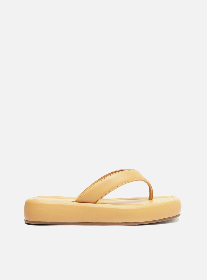 Sandália nude. O modelo tem salto baixo flatform e bico quadrado. Traz tiras largas dividindo os dedos. Com palmilha da cor do modelo e inscrição do nome da marca. Aberta, a sandália exibe parte do pé.
