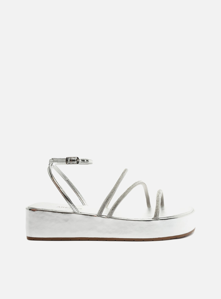 Sandália prata. O modelo tem salto baixo flatform e bico quadrado. Traz uma tira bombada sobre os dedos, uma no peito do pé e uma na diagonal, todas cobertas por strass. Possui tira fina lisa que sai das laterais, se cruza no calcanhar, contorna o tornozelo e fecha em fivela lateral. A sandália é aberta e exibe todo o pé. Com palmilha da cor do modelo e inscrição do nome da marca.