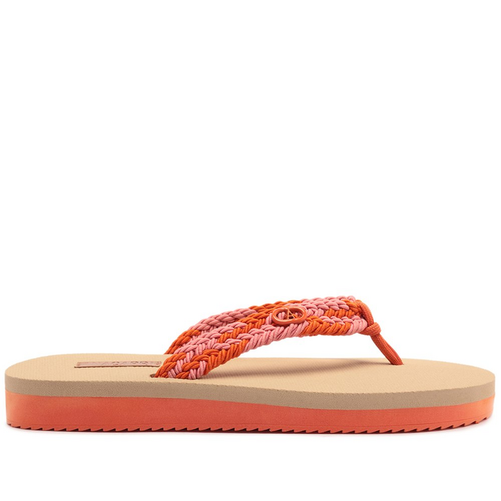 Sandália emborrachada, com salto baixo e solado bicolor flatform. O modelo possui base tratorada laranja que garante leveza e aderência no caminhar, além de biqueira arredondada. O cabedal traz tiras largas em crochê bicolor em tons de laranja e bege, unidas ao centro com aplicação de pin metálico discreto. A palmilha nude apresenta tag marrom em material similar ao couro com assinatura Anacapri. Porque Apostar: A flip flop da vez chega em versão fun & fresh, perfeita para os dias quentes da estação! Com tiras em crochê bicolor, o modelo traz aquele mood handmade que é super tendência no Verão’26. O solado flatform bicolor com base tratorada garante conforto e estilo descomplicado para acompanhar do look praia ao rolê casual. Um item cool que vai colorir suas produções all day long!