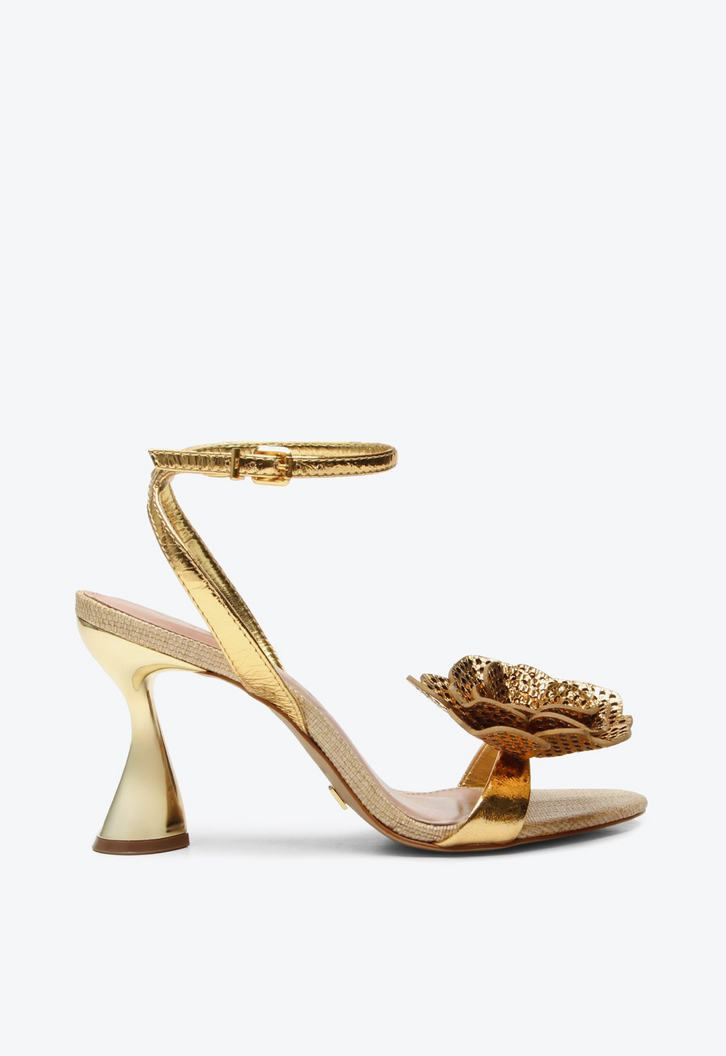 Sandália feminina de salto alto em couro dourado. O salto escultural destaca-se pelo design estiloso, que equilibra modernidade e sofisticação. O adorno floral frontal, trabalhado com recortes a laser, confere leveza e um efeito romântico ao visual. Com um brilho discreto e fashion, transformando essa sandália em uma peça-chave para quem deseja composições elegantes e versáteis na temporada mais quente do ano.