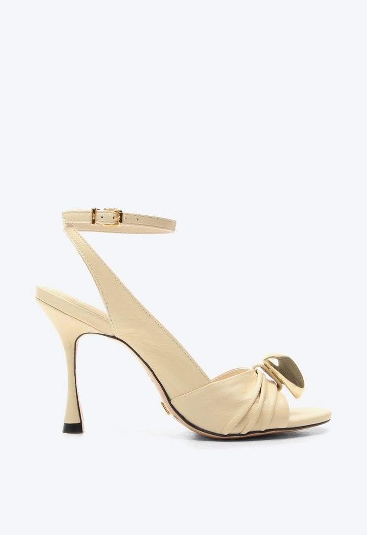 Sandália feminina de salto alto bege em couro. Uma escolha sofisticada e cheia de personalidade, este modelo traz o toque autêntico VCZ com seu couro drapeado e acabamento metalizado. Possui design moderno e elegante, sendo uma opção perfeita para presentear ou elevar qualquer look com estilo.