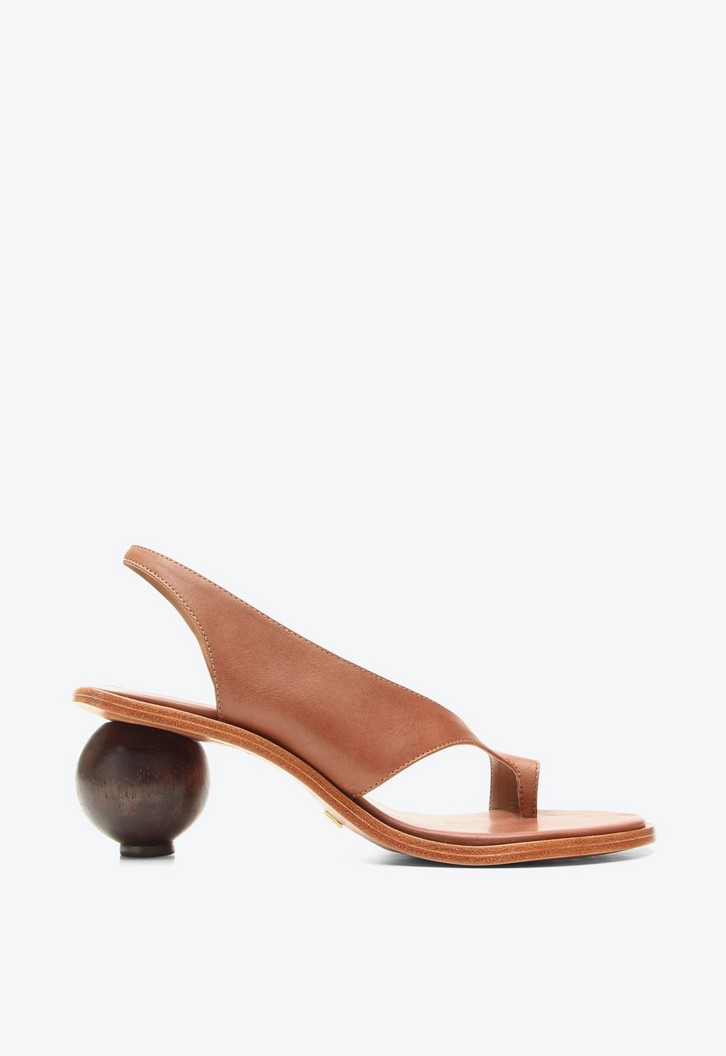 Sandália Julie Caramelo. O salto escultural em formato de esfera é o grande destaque, unindo design e conforto em um elemento visual impactante. Minimalista e sofisticada, essa sandália é a cara da estação: leve, fashion e super cool para combinar com seus looks de verão!