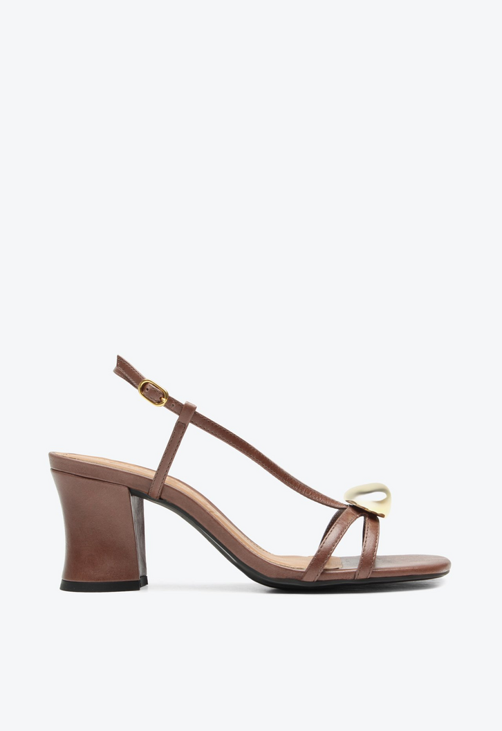 Sandália feminina de salto médio em couro marrom. Com design minimalista e elegante, esse modelo se destaca pelo adorno geométrico metalizado na parte frontal, que confere um toque de modernidade ao visual. As tiras finas desenham o pé com delicadeza, garantindo um caimento leve e delicado. Ideal para ocasiões que pedem sofisticação com conforto, é uma sandália versátil para compor desde produções mais formais até looks contemporâneos no dia a dia.