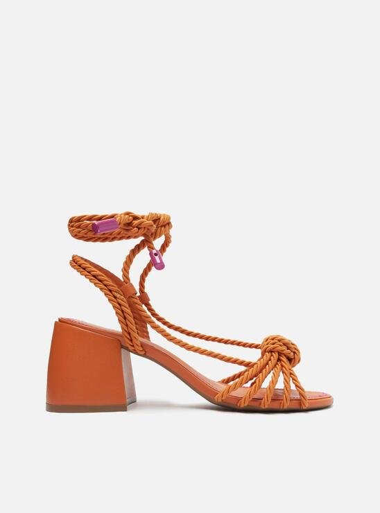 Sandália laranja. O modelo tem salto médio bloco e bico redondo. Traz tiras em cordões torcidos sobre os dedos, unidas por nó grande central. Duas sobem o peito do pé pelas laterais, contornam o tornozelo e fecham em amarração superior. Possui ainda tira de cordão em torno do calcanhar. Com palmilha da cor do modelo, contorno em costura contrastante roxa e inscrição do nome da marca.
