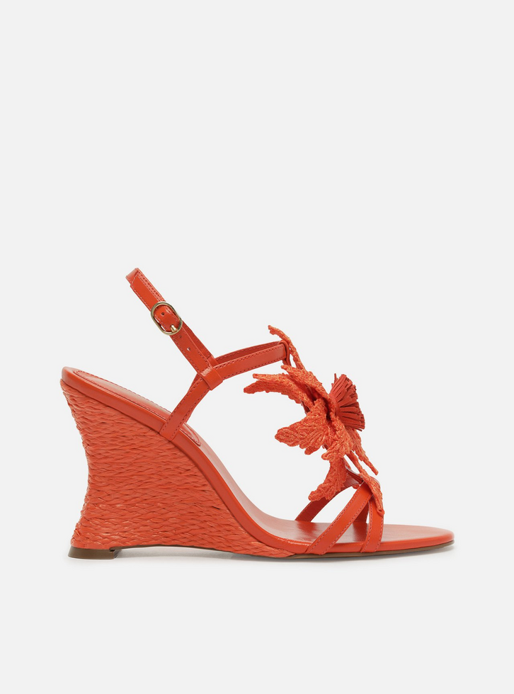 Sandália feminina laranja de couro. O sapato tem salto alto anabela curvo, revestido em material trançado, e formato arredondado na ponta. Traz tiras finas sobre os dedos e a parte superior do pé, além de tira central com aplicação de flor em ráfia, com pétalas recortadas e tiras de couro no centro. Possui tira fina no calcanhar com fecho em fivela lateral. Com palmilha da cor da sandália e inscrição do nome da marca.