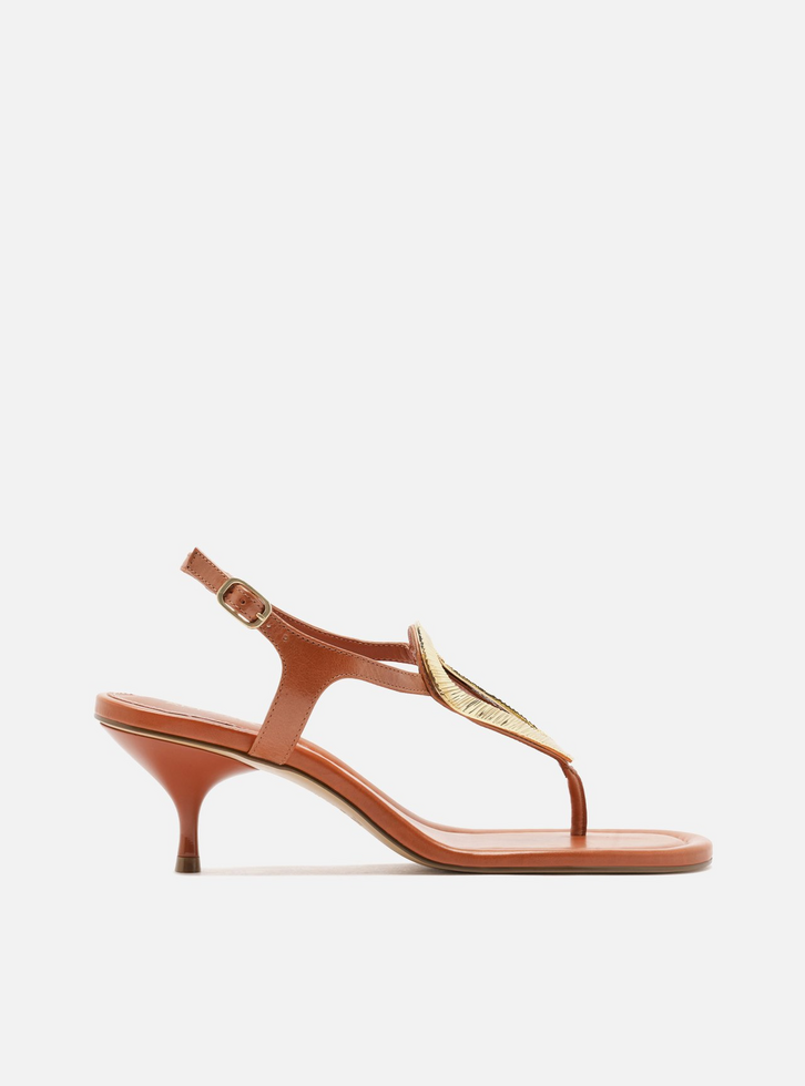 Sandália feminina de couro laranja. O sapato tem salto baixo fino e formato arredondado na ponta. Traz tiras finas dividindo os dedos, com aplicação de metal dourado, grande, vazado e com textura riscada no centro. Possui tira na parte superior do pé e tira no calcanhar com fecho em fivela metálica. Com palmilha da cor do calçado, contorno em pesponto e inscrição do nome da marca. A sandália exibe todo o pé.