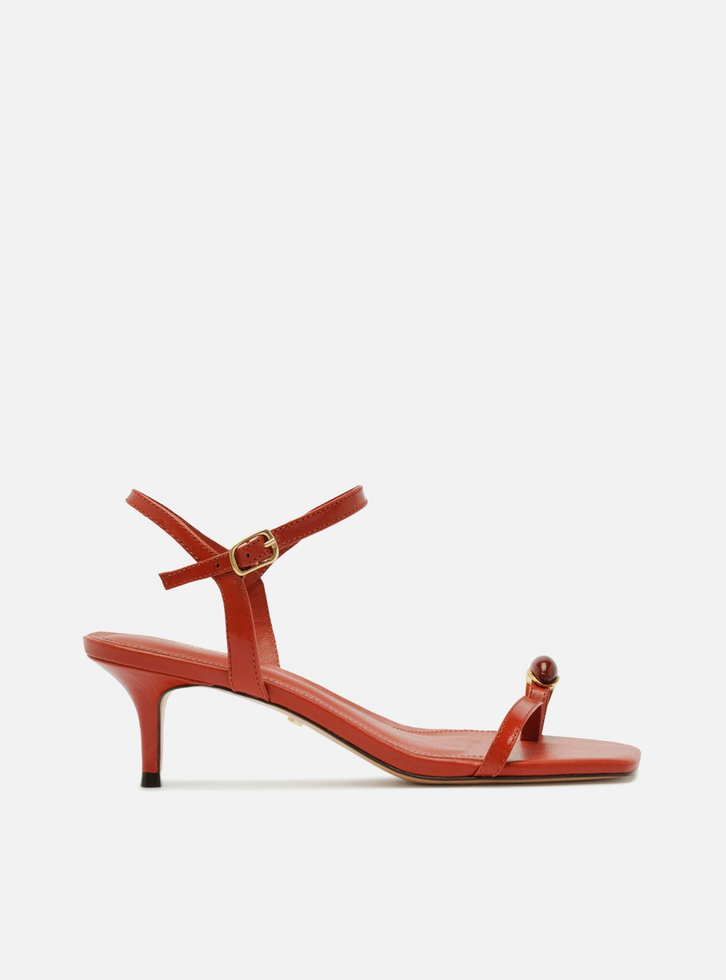 Sandália feminina laranja de couro. O sapato tem salto médio fino e formato quadrado na ponta. Traz tira fina sobre os dedos e tira fina em torno do dedão com aplicação de pedra e base em metal dourado. Possui tira fina no calcanhar, conectada à tira fina no tornozelo que fecha em fivela lateral. Com palmilha da cor do modelo e inscrição do nome da marca. A sandália exibe todo o pé.