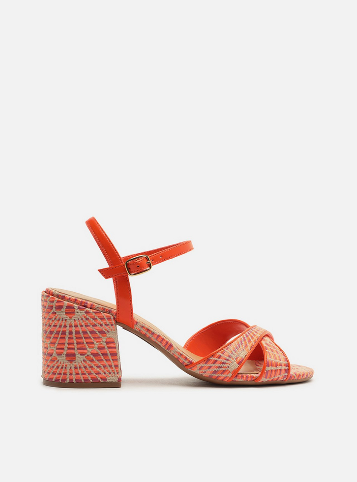 Sandália feminina laranja em material com estampa tropical em bege. O sapato tem salto médio bloco e formato arredondado na ponta. Traz duas tiras cruzadas sobre os dedos. Possui tira fina no calcanhar, conectada à tira fina no tornozelo que fecha em fivela lateral. Com palmilha bege e inscrição do nome da marca.