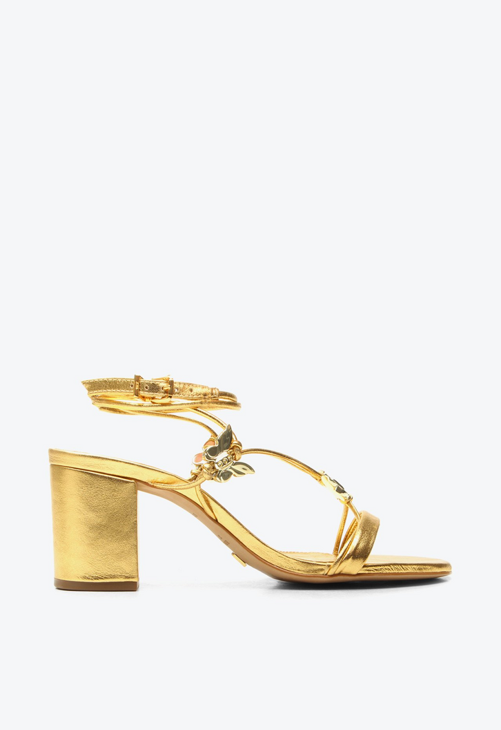 Sandália feminina Mantua dourada em couro. Com design delicado e acabamento sofisticado, essa sandal traz detalhes em formato de borboletas que adicionam um charme especial ao visual. O salto bloco garante conforto e estabilidade, enquanto o brilho dourado transforma o modelo em um destaque imediato nas produções. Leve e elegante, é a escolha ideal para compor looks femininos e cheios de estilo.