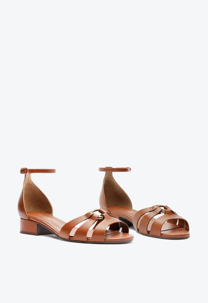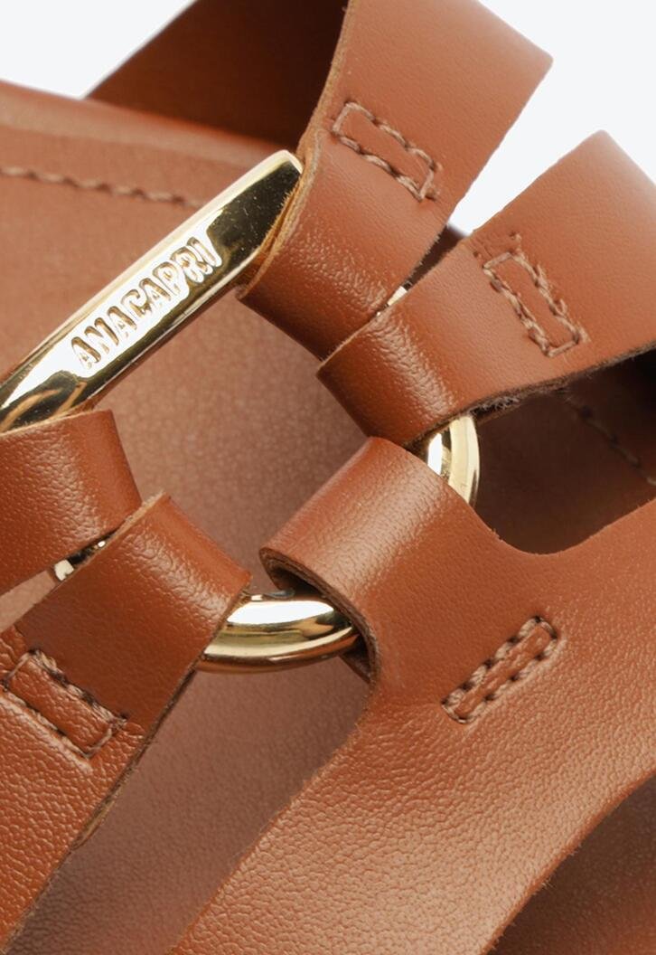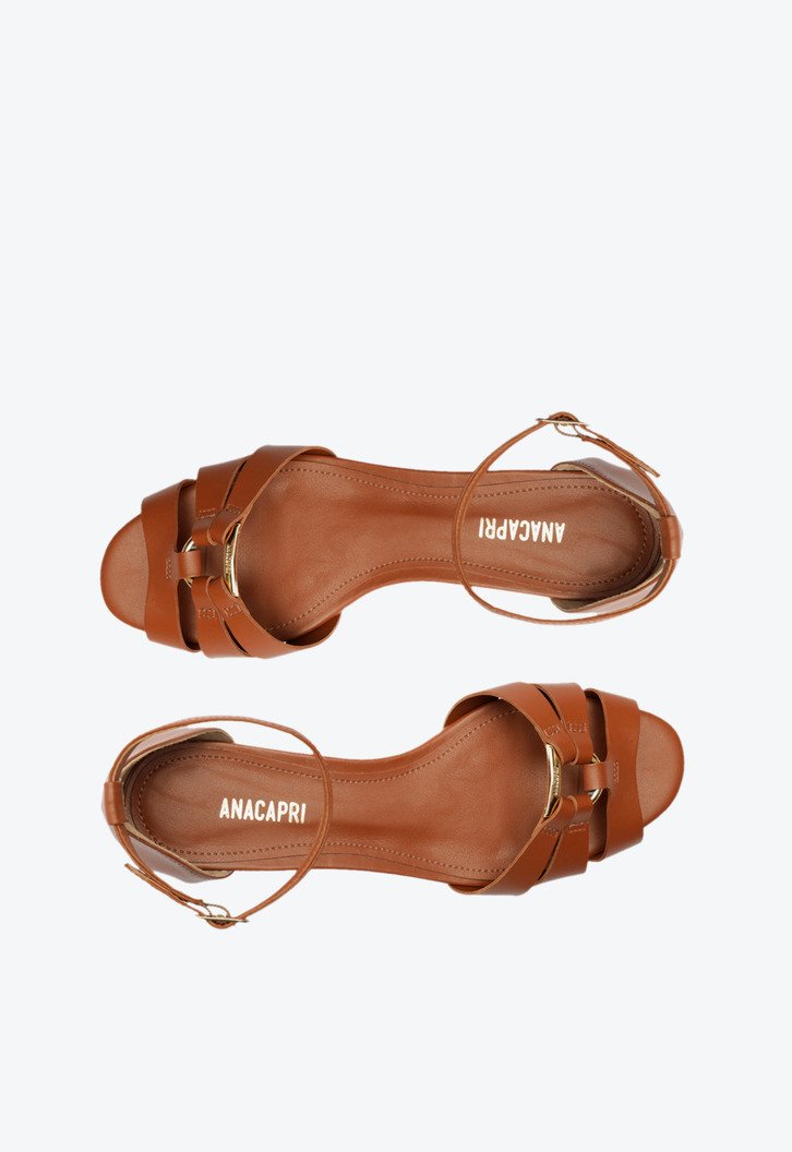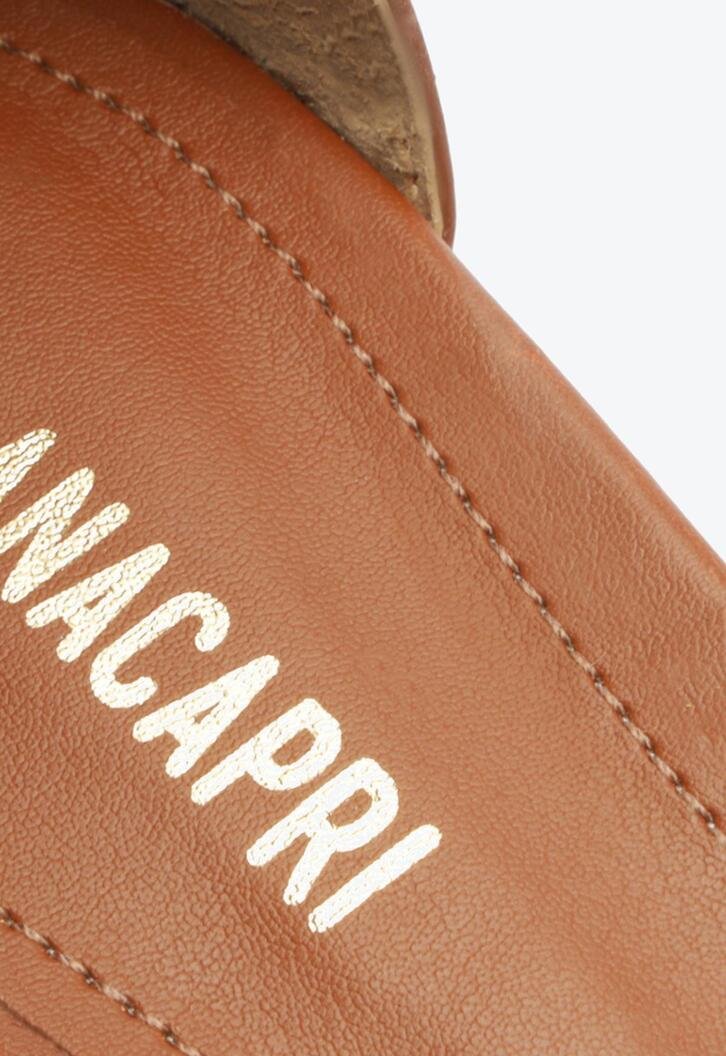 Sandália Anacapri de salto bloco com recortes vazados e detalhe em fivela, na cor marrom. O modelo de salto em bloco baixo possui biqueira arredondada - com design de recortes vazados - em trio de tirinhas finas sobre os dedos. De material similar ao couro com acabamento envernizado, traz contorno superior com costura pesponto delicado e aplicação de fivela metálica redonda na gáspea. Fechada no calcanhar, possui tira fina que contorna o tornozelo, com fecho lateral por fivela metálica. Apresenta palmilha marrom, com assinatura Anacapri. A sandália deixa parte dos dedos e laterais à mostra.