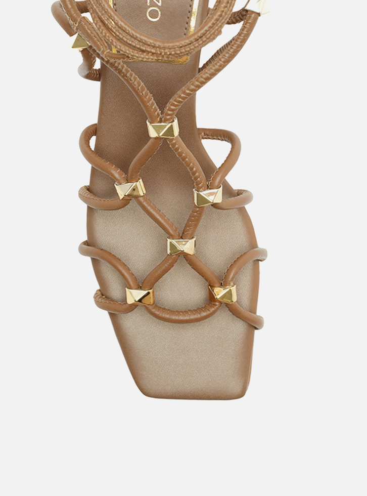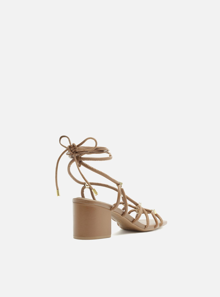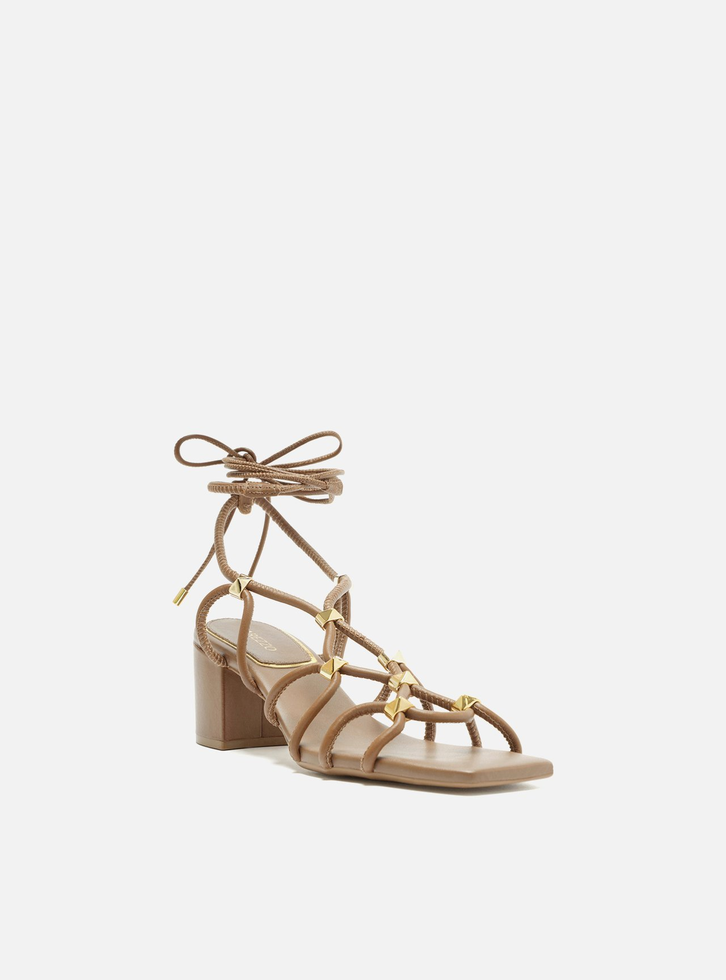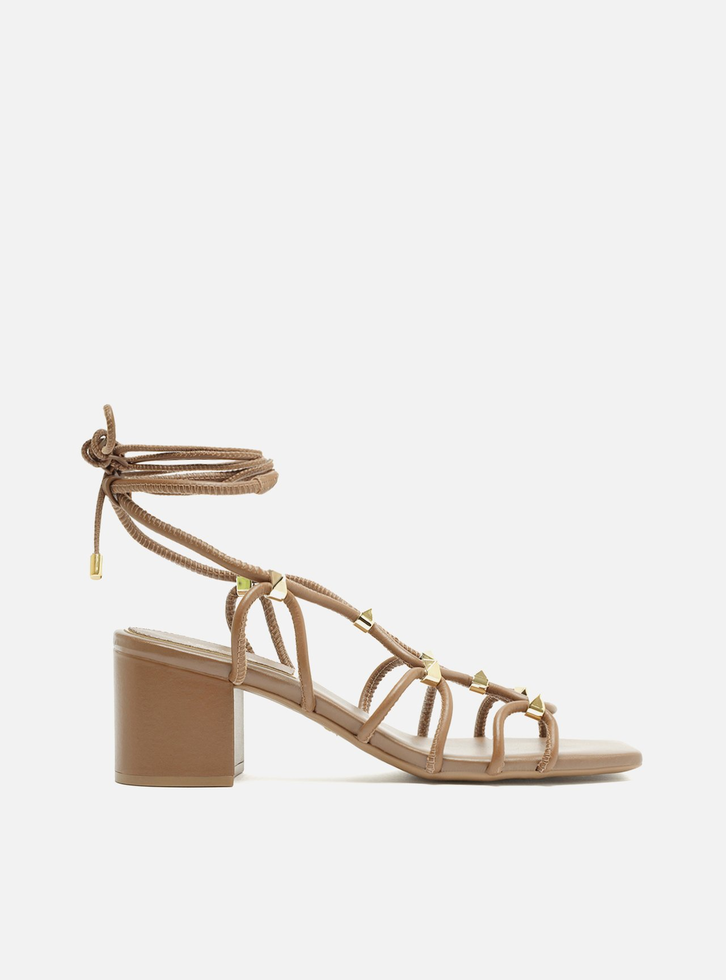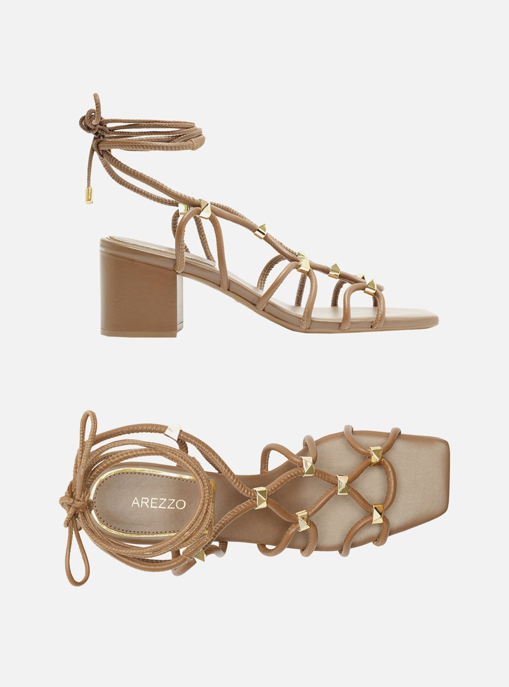 Sandália marrom. Possui tiras finas com detalhes em tachas que se cruzam no peito do pé e tiras finas que prendem o tornozelo. Com salto bloco, bico quadrado e logotipo da Arezzo na palmilha.