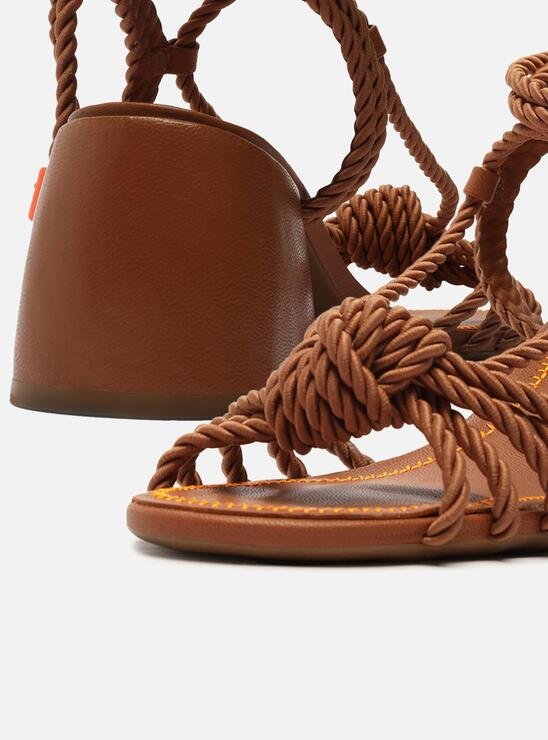 Sandália marrom. O modelo tem salto médio bloco e bico redondo. Traz tiras em cordões torcidos sobre os dedos, unidas por nó grande central. Duas sobem o peito do pé pelas laterais, contornam o tornozelo e fecham em amarração superior. Possui ainda tira de cordão em torno do calcanhar. Com palmilha da cor do modelo, contorno em costura contrastante laranja e inscrição do nome da marca.