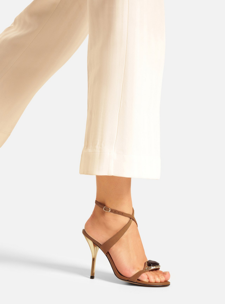 Sandália feminina marrom em camurça. O sapato tem salto alto fino dourado e formato arredondado na ponta. Traz tira fina sobre os dedos com aplicação de pedra grande e metal dourado. Possui tiras finas que saem das laterais, cruzam na parte frontal, contornam o tornozelo e fecham em fivela lateral. Com palmilha da cor do modelo e inscrição do nome da marca. A sandália exibe todo o pé.