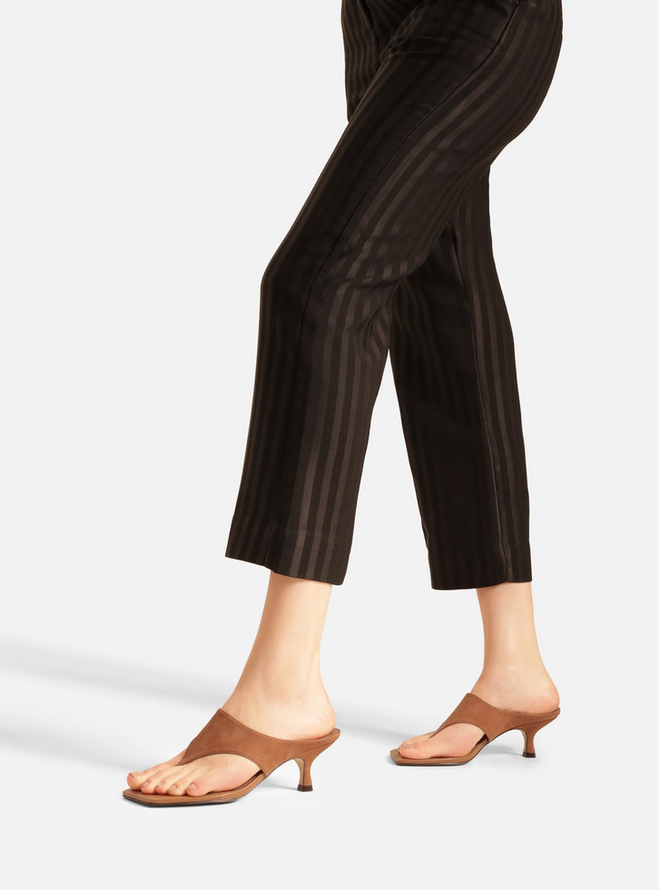 Sandália feminina marrom em camurça. O sapato tem salto baixo fino e formato quadrado na ponta. Traz tira larga dividindo os dedos, em formato triangular, que cobre parcialmente a parte superior do pé até as laterais. Com palmilha da cor da sandália e inscrição do nome da marca.