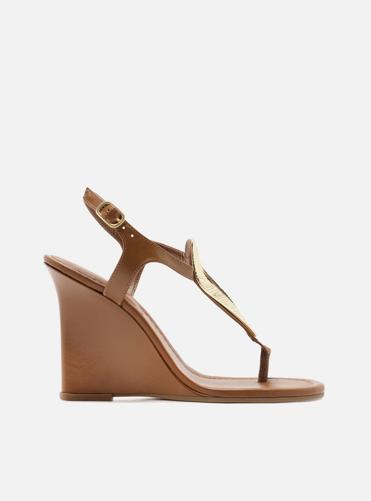 Sandália feminina de couro marrom. O sapato tem salto alto anabela e formato quadrado na ponta. Traz tira dedeira e tira central com aplicação de metal dourado, grande, vazado e com textura riscada no centro. Possui tira no tornozelo com fecho em fivela metálica. Com palmilha da cor do calçado, contorno em pesponto e inscrição do nome da marca. A sandália exibe todo o pé.